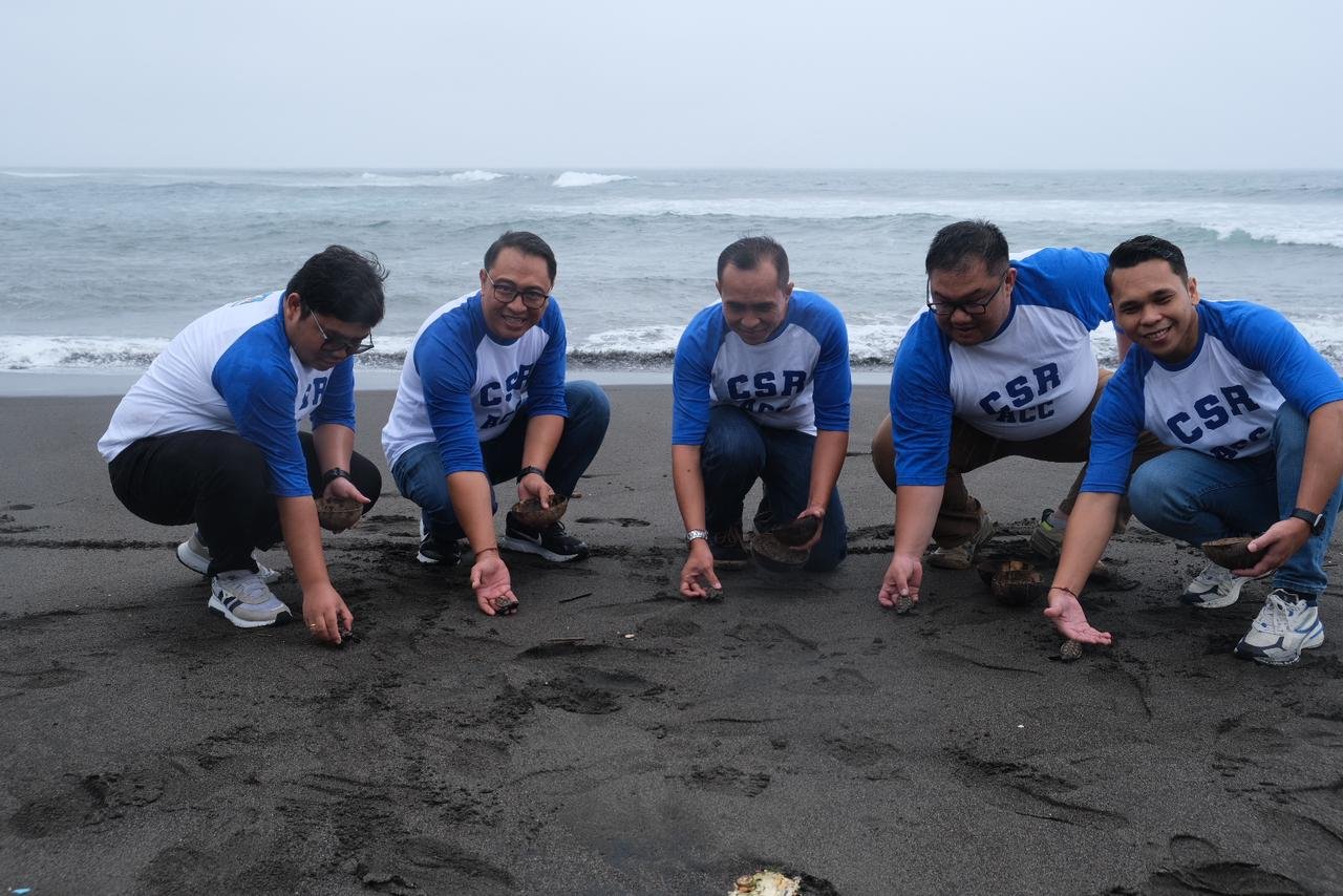 StockReview.id – (Ki-Ka) ARManagement Head ACC Renon Dedi Hasiholan, Branch Manager ACC Denpasar Ary Wiadnyana, AR Management Head ACC Denpasar Wisnu Agung, Customer Retention & Service Head ACC Denpasar Eka Candra dan Customer Retention & Service Head ACC Abdullah Aziz saat melepas tukik di Pantai Saba Asri, Gianyar, Bali. dok ACC