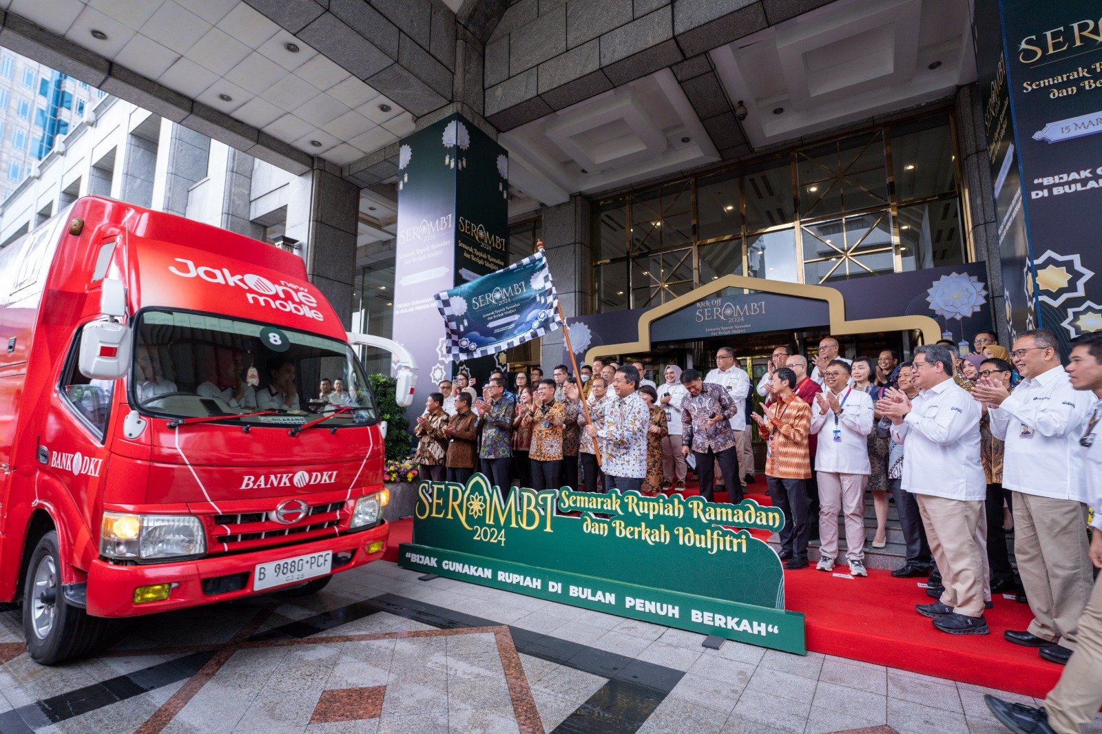 StockReview.id – Direktur Teknologi dan Operasional, merangkap Pelaksana Tugas (Plt.) Direktur Utama Bank DKI, Amirul Wicaksono (baris pertama, memegang bendera), disaksikan Kepala Departemen Pengelolaan Uang Bank Indonesia, Marlison Hakim (baris pertama, paling kanan), Deputi Gubernur Bank Indonesia, Doni Primanto Joewono (baris pertama, kedua dari kanan), dan Direktur dari berbagai Bank di Indonesia, secara simbolis melepas Mobile Branch Bank DKI pada acara Kick Off SERAMBI pada Jumat (15/3/2024).