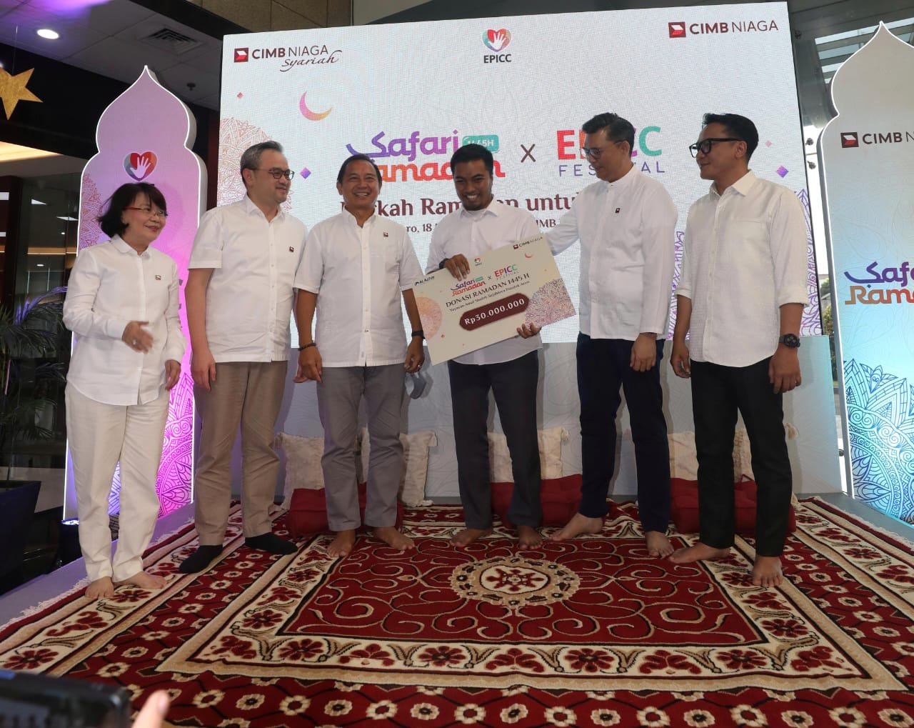 StockReview.id – Komisaris Independen CIMB Niaga Jeffrey Kairupan (ketiga kiri) bersama Direktur Strategy, Finance & SPAPM CIMB Niaga Lee Kai Kwong (kedua kiri), Direktur Operations & IT CIMB Niaga Tjioe Mei Tjuen (kiri), Chief Audit Executive CIMB Niaga Antonius Gunadi (kedua kanan), dan Presiden Direktur CNAF Ristiawan Suherman (kanan) memberikan donasi secara simbolis kepada perwakilan Yayasan Amal Sholeh Sejahtera di sela Safari Ramadan 2024 di Griya CIMB Niaga Bintaro, Tangerang Selatan, Senin (18/3/2024). CIMB Niaga menyelenggarakan Safari Ramadan di sejumlah kota di Indonesia mulai 18 hingga 28 Maret 2024 sebagai ajang silaturahim antara komisaris, direksi, dan senior leaders dengan karyawan CIMB Niaga dan anak perusahaan. Acara juga dirangkai dengan kegiatan corporate social responsibility (CSR) sebagai wujud kepedulian kepada masyarakat di sekitar kantor cabang CIMB Niaga. Foto: SRID/Ruht Semiono