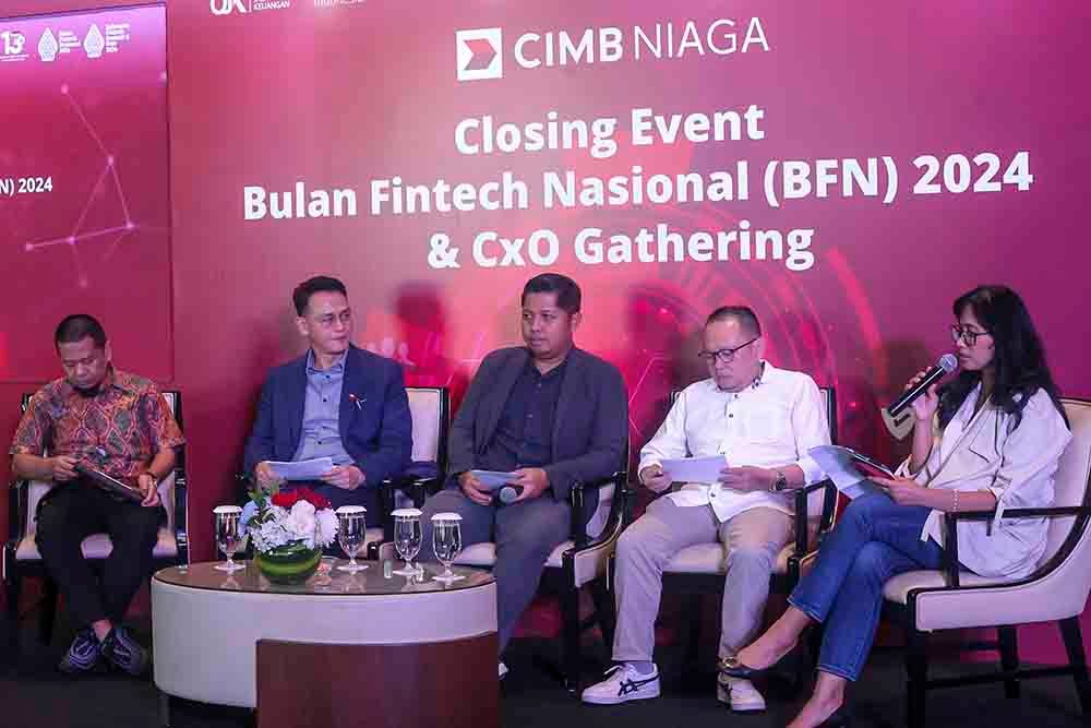 StockReview.id – Head of Digital Economy CIMB Niaga Dedy Sahat (kedua kiri) bersama Deputi Direktur Departemen Kebijakan Sistem Pembayaran Bank Indonesia (BI) Novyanto (kiri), Presiden Direktur ShopeePay Indonesia Radityo Triatmojo (kedua kaban), dan Direktur Government Relations Xendit Group Rifai Taberi (kanan) saat diskusi panel Event Closing Bulan Fintech Nasional (BFN) bertema “Integrating Innovation: Empowering Digital Growth and Financial Inclusion through Bank-Fintech Collaboration” di Jakarta, Kamis (12/12/2024). Partisipasi CIMB Niaga dalam BFN 2024 merupakan wujud komitmen untuk terus memperkuat kerja sama antara perbankan dengan fintech. Salah satu wujud dukungan tersebut yaitu meyediakan layanan CIMB Niaga API (Application Programming Interface) yang memudahkan integrasi teknologi untuk mitra fintech, sehingga proses pembukaan rekening digital, pembayaran tagihan, hingga transaksi berbasis QRIS dapat berjalan lebih cepat, aman, dan efisien. Foto: SRID/Ruht Semiono