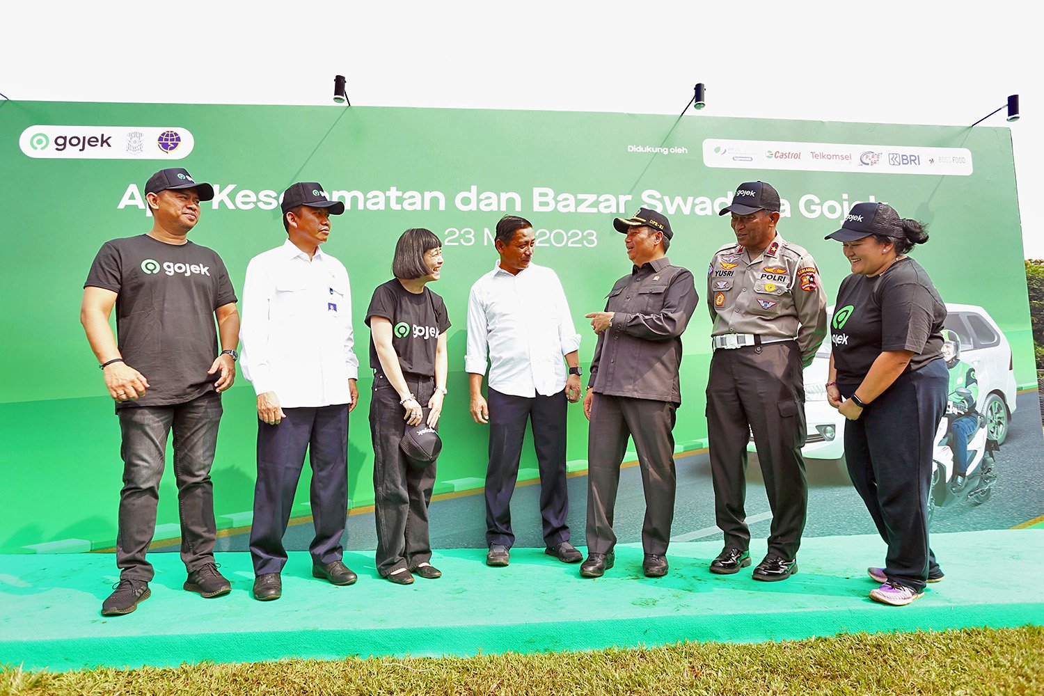 StockReview.id – (kiri ke kanan) Gede Manggala – Head of Region and External Relations Gojek, Suharto – Direktur Angkutan Jalan Kementerian Perhubungan, Catherine Hindra Sutjahyo – President Gojek, Irjen (Pol.) Hendro Sugiatno – Direktur Jenderal Hubungan Darat Kementerian Perhubungan, Lasarus – Ketua Komisi V DPR Republik Indonesia, Brigjen (Pol.) Drs. Yusri Yunus – Direktur Registrasi dan Identifikasi Korps Lalu Lintas Polri, dan Shinto Nugroho – Chief Public Policy and Government Relations Gojek, dalam acara Apel Keselamatan Berkendara Gojek bersama Korlantas Polri di Jakarta (23/5/2023). Kegiatan apel bersama ratusan mitra driver Gojek ini dilakukan untuk menguatkan komitmen bersama mengenai pentingnya keselamatan berkendara sekaligus sebagai dukungan Gojek dan Korlantas Polri terhadap keamanan serta keselamatan penumpang dan mitra driver Gojek dari resiko kecelakaan lalu lintas. Foto: SRID/Ruht Semiono