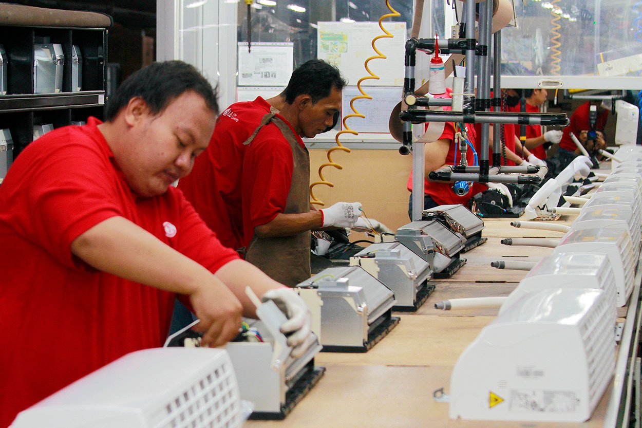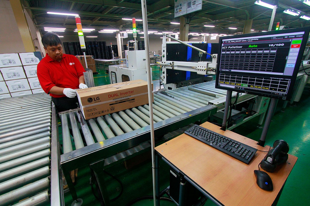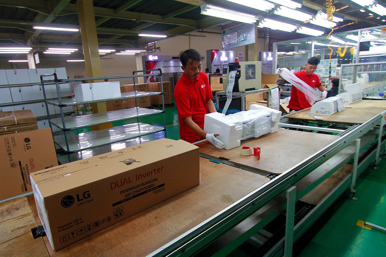 StockReview.id – (dari kiri ke kanan) Direktur Industri Elektronika dan Telematika Kementerian Perindustrian Priyadi Arie, President of LG Electronics Indonesia Jung Jae Hoon, Production Leader of LGEIN Tangerang Factory Jaeho Leem, Manufacturing Department Leader of LGEIN – Tangerang Factory Amirul Setiya Adi berbincang saat meninjau produksi AC di LG Factory, Legok, Kabupaten Tangerang, Banten, Selasa (23/5/2023). LG akan memproduksi AC Multi V untuk bangunan komersial dan gedung perkantoran pada kuartal IV tahun 2023 dengan target produksi perdana sebanyak 100 unit per bulan. Foto: SRID/Ruht Semiono