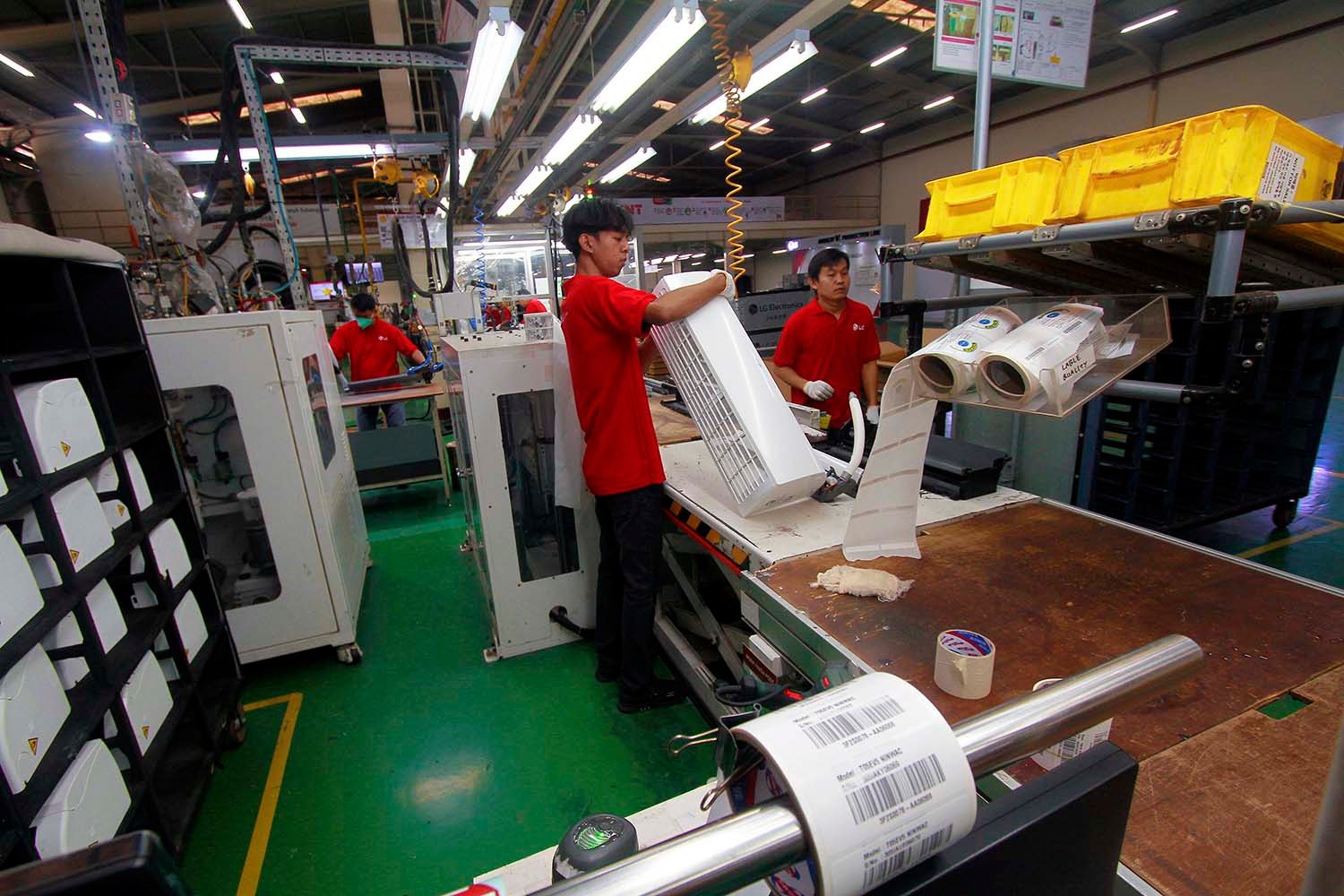StockReview.id – (dari kiri ke kanan) Direktur Industri Elektronika dan Telematika Kementerian Perindustrian Priyadi Arie, President of LG Electronics Indonesia Jung Jae Hoon, Production Leader of LGEIN Tangerang Factory Jaeho Leem, Manufacturing Department Leader of LGEIN – Tangerang Factory Amirul Setiya Adi berbincang saat meninjau produksi AC di LG Factory, Legok, Kabupaten Tangerang, Banten, Selasa (23/5/2023). LG akan memproduksi AC Multi V untuk bangunan komersial dan gedung perkantoran pada kuartal IV tahun 2023 dengan target produksi perdana sebanyak 100 unit per bulan. Foto: SHID/Ruht Semiono