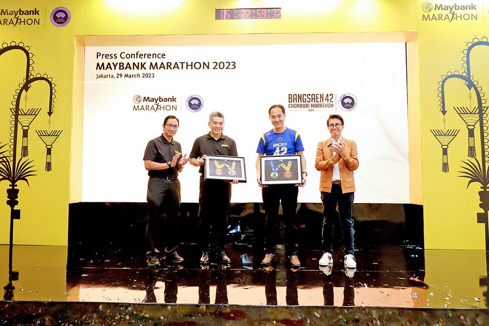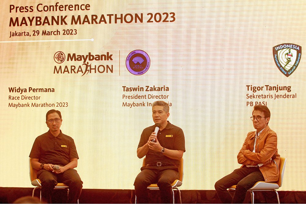 StockReview.id – Presiden Direktur Maybank Indonesia, Taswin Zakaria, Project Director Maybank Marathon, Widya Permana, Sekretaris Jenderal Pengurus Besar Persatuan Atletik Seluruh Indonesia (PB PASI), Tigor Tanjung, mitra sponsor serta perwakilan komunitas pelari dari Jakarta dan sekitarnya mengumumkan penyelenggaraan Maybank Marathon 2023 usai konferensi pers di Jakarta, Rabu (29/3/2023). Maybank Indonesia mengumumkan penyelenggaraan ajang World Athletics? Elite Label Road Race Maybank Marathon 2023 yang akan dilaksanakan di Bali Safari & Marine Park Gianyar pada 27 Agustus 2023 dengan memperlombakan kategori marathon (42,195 km), half-marathon (21,1 km) dan 10K, serta Children Sprint dengan total hadiah lebih dari Rp2,7 miliar. registrasi Maybank Marathon 2023 di Bali akan dibuka untuk umum pada hari Selasa, 4 April 2023 pukul 13.00 WIB melalui situs https://www.maybank.co.id/Maybank- Marathon. Foto: SRID/Ruht Semiono