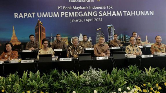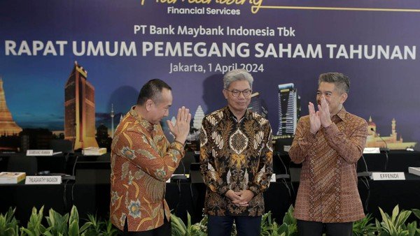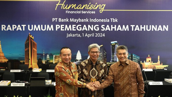 StockReview.id – Presiden Komisaris Maybank Indonesia Dato’ Khairussaleh Ramli (tengah) bersama Steffano Ridwan (kiri) selaku Presiden Direktur Maybank Indonesia dengan masa jabatan efektif setelah mendapatkan persetujuan Otoritas Jasa Keuangan (OJK) dan Taswin Zakaria (kanan) yang telah berakhir masa jabatannya sebagai Presiden Direktur Maybank Indonesia pada RUPST 2024 pada Senin (1/04/2024). Selain menyetujui perubahan susunan Dewan Komisaris dan Direksi, RUPST juga menyetujui Laporan Keuangan Konsolidasian untuk tahun buku yang berakhir pada tanggal 31 Desember 2023 dengan Laba Bersih sebesar Rp1,74 triliun, Dari Laba Bersih tersebut, sebesar 45% atau setara dengan Rp785 miliar untuk dibagikan sebagai dividen tunai kepada pemegang saham dengan nilai Rp10,29 per saham, sisanya yakni sebesar 55% atau setara dengan Rp959 miliar akan digunakan sebagai laba ditahan. Foto: SRID/Ruht Semiono