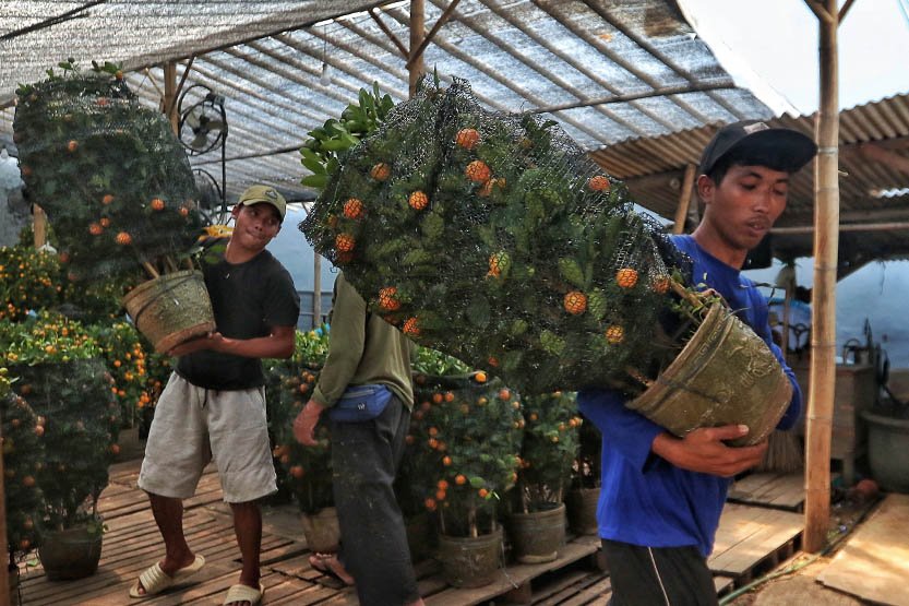 StockReview.id – Pekerja saat mengangkat tanaman buah jeruk kimkit di Meruya, Jakarta Barat, Senin (16/1/2023). Permintaan jeruk kimkit meningkat jelang perayaan imlek karena dipercaya membawa keberuntungan. Banyak pembeli membeli tanaman buah jeruk tersebut untuk dikirim kepada kerabat dan juga sebagai hiasan. Foto: SRID/Ruht Semiono