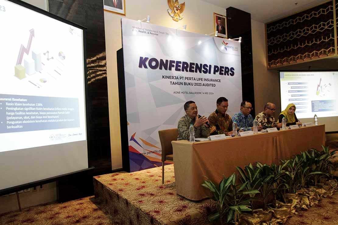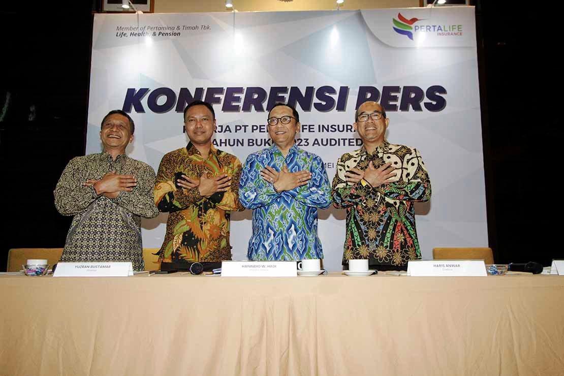 StockReview.id – Jajaran Manajemen PT Perta Life Insurance (PertaLife Insurance) dari kiri ke kanan: Appointed Actuary (Joko Suwaryo), Direktur Keuangan & Investasi (Yuzran Bustamar), Direktur Utama (Hanindio W. Hadi), dan Direktur Pemasaran (Haris Anwar), foto bersama saat Pemaparan Perta Life Insurance Tahun Buku 2023 yang berlangsung di AONE Hotel Ballroom, Jakarta (14/5/2024). PertaLife Insurance kembali menorehkan kinerja gemilang sepanjang 2023 dengan meraih laba bersih sebesar Rp96,14 Miliar atau meningkat sebesar 32,61% dibandingkan tahun sebelumnya sebesar Rp72,49. Laba tersebut ditopang oleh kenaikan pendapatan premi, pendapatan investasi, dan imbal jasa DPLK. Foto: SRID/Ruht Semiono