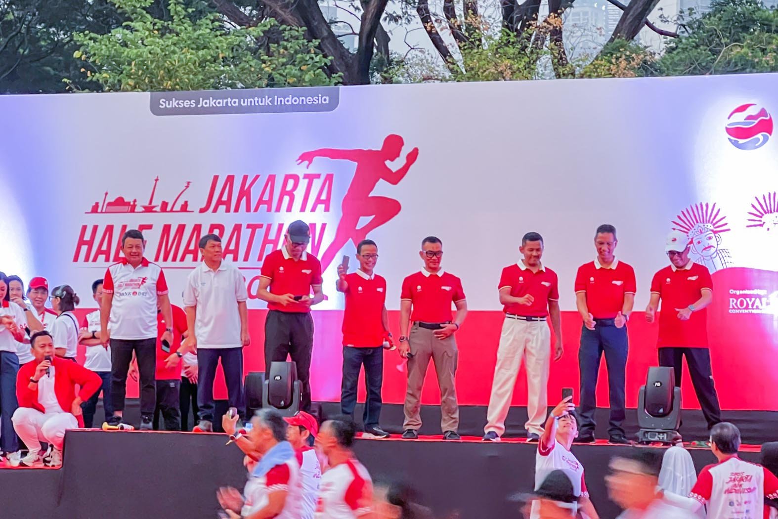 StockReview.id – Direktur Teknologi & Operasional Bank DKI merangkap Pelaksana Tugas (Plt.) Direktur Utama Bank DKI, Amirul Wicaksono (Empat dari kanan foto) mendampingi Menteri Perhubungan, Budi Karya Sumardi beserta Pj. Gubernur DKI Jakarta, Heru Budi Hartono dan pejabat lainnya dalam pelepasan (flag off) para pelari peserta Jakarta Half Marathon 2023 di Kawasan Monas, Jakarta Pusat (20/08).