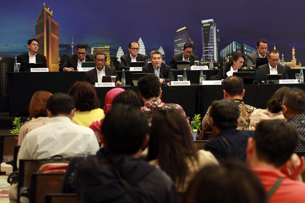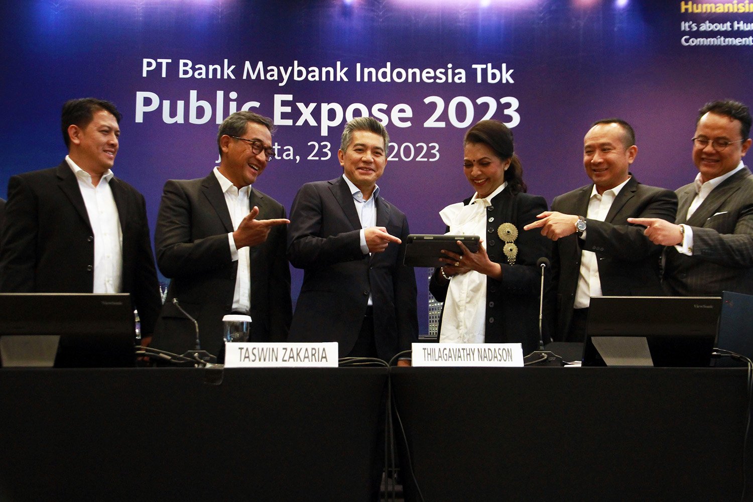 StockReview.id – Presiden Direktur Taswin Zakaria (tengah, kelima dari kiri) dan Direktur Keuangan Thilagavathy Nadason (tengah, keempat dari kanan) bersama jajaran direksi PT Bank Maybank Indonesia Tbk (Maybank Indonesia) berfoto bersama usai Public Expose 2023 yang diselenggarakan hari ini (23/5/2023w) di Kantor Pusat Maybank Indonesia, Jakarta. Maybank Indonesia menyampaikan pencapaian kinerja perusahaan yang positif pada kuartal pertama tahun 2023, di antaranya adalah peningkatan laba sebelum pajak (PBT) 33,3% menjadi Rp750 miliar dari Rp562 miliar periode yang sama tahun sebelumnya. Foto: SRID/Ruht Semiono