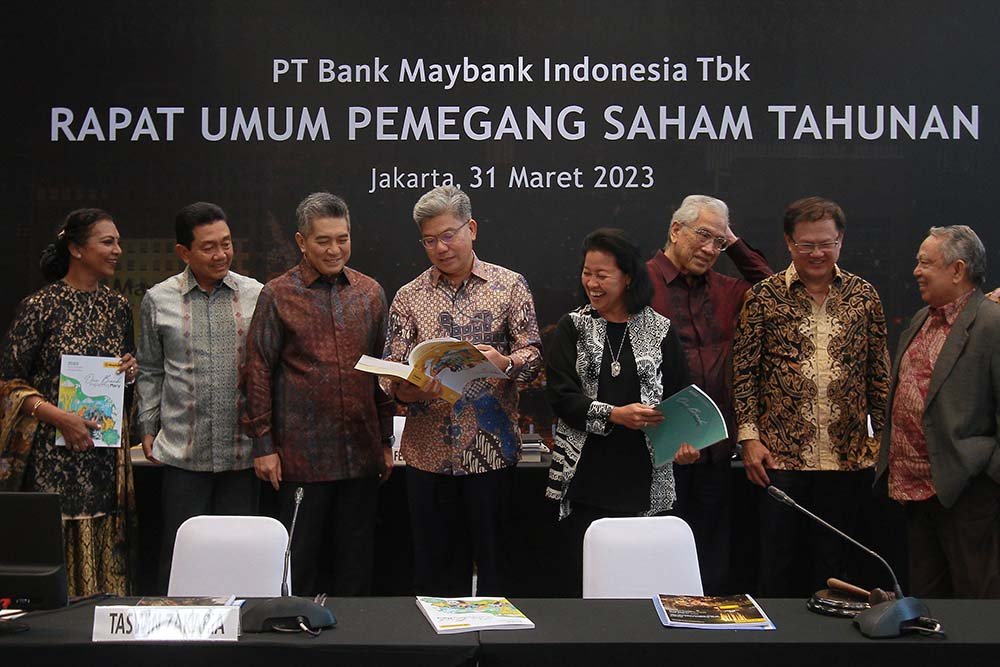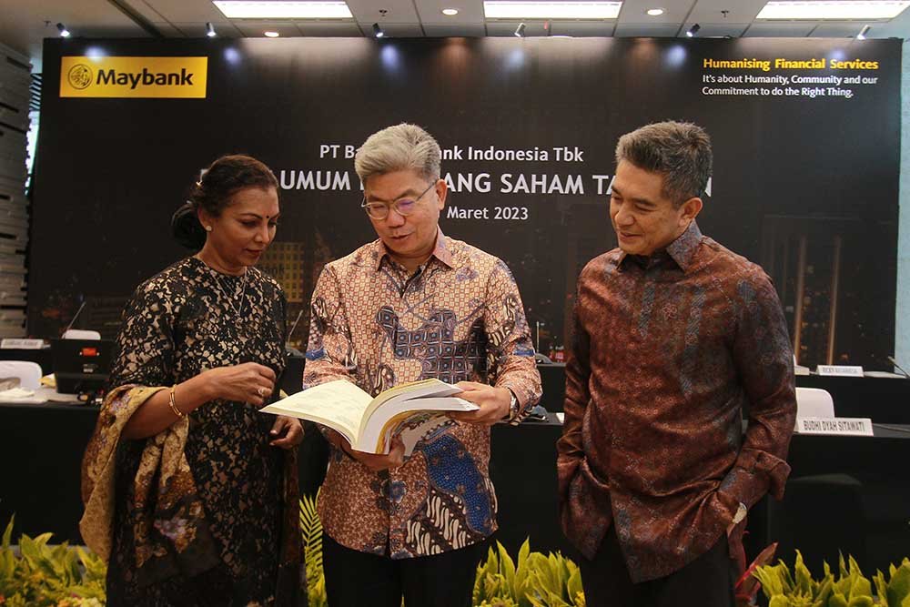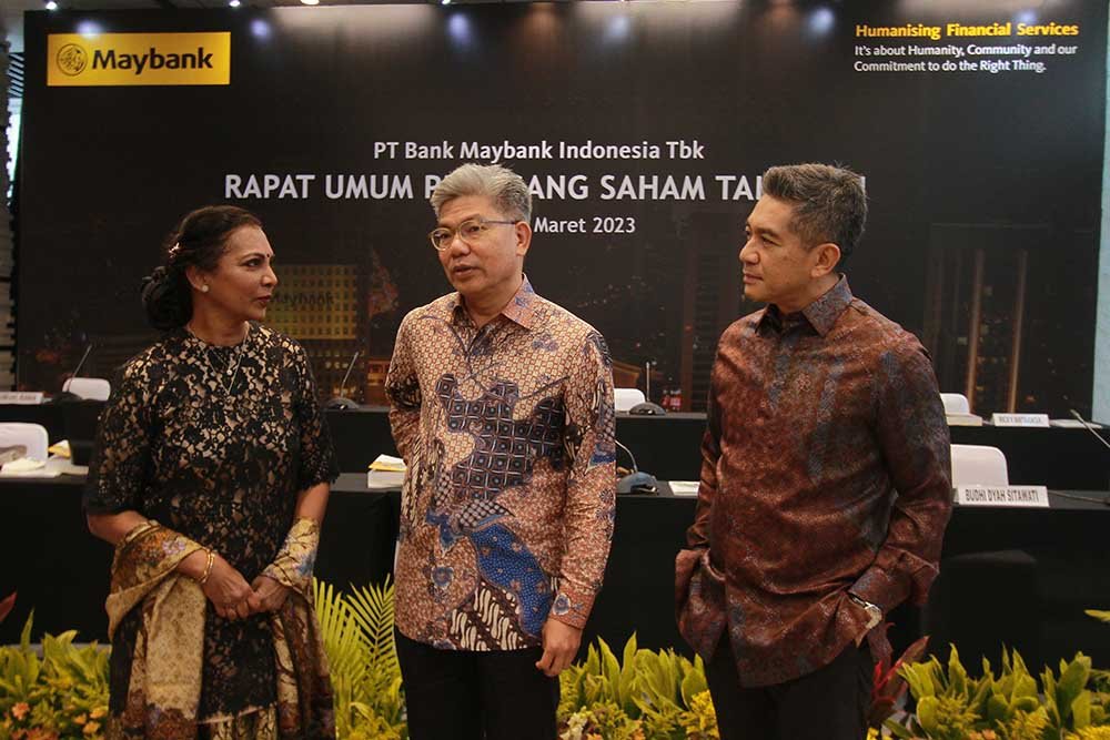 StockReview.id – Direktur Keuangan Thilagavathy Nadason (kiri), Presiden Komisaris Dato’ Khairussaleh Ramli (tengah), Presiden Direktur Taswin Zakaria (kanan) seusai rapat Umum Pemegang Saham Tahunan (RUPST) di Kantor Pusat Maybank Indonesia, Senayan, Jakarta, Jumat (31/3/2023). RUPST Maybank Indonesia menyetujui Laporan Keuangan Konsolidasi yang telah diaudit untuk tahun buku yang berakhir pada 31 Desember 2022. Pengangkatan kembali Edwin Gerungan sebagai Komisaris, dan Hendar sebagai Komisaris Independen Maybank Indonesia dengan masa jabatan terhitung sejak ditutupnya RUPST sampai dengan penutupan RUPST Bank tahun 2026. Pengangkatan kembali Effendi, Steffano Ridwan dan Ricky Antariksa sebagai Direktur Maybank Indonesia dengan masa jabatan terhitung sejak ditutupnya RUPST sampai dengan penutupan RUPST Bank tahun 2026. SRID/Ruht Semiono