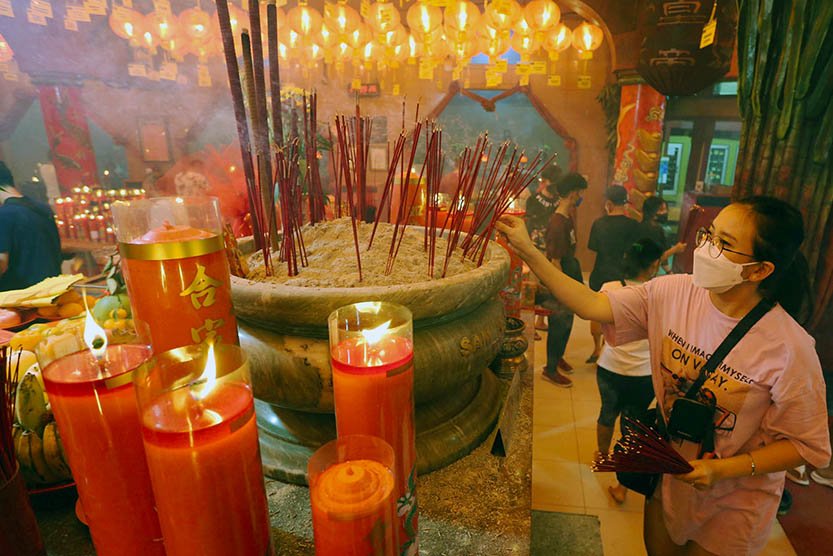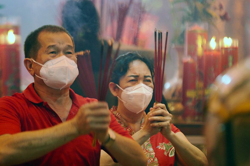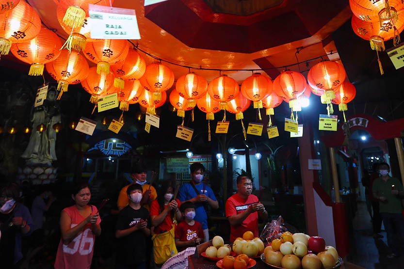 StockReview.id – Warga keturunan Tionghoa melaksanakan sembahyang pada malam Tahun Baru Imlek 2574 di Wihara Boen San Bio, Kota Tangerang, Banten, Sabtu (21/1/2023). Sembahyang malam pergantian tahun baru Imlek itu sebagai ungkapan syukur atas segala rejeki dan keselamatan dari Tuhan serta untuk pengharapan kehidupan lebih baik di tahun Kelinci Air mendatang. Foto: SRID/Ruht Semiono